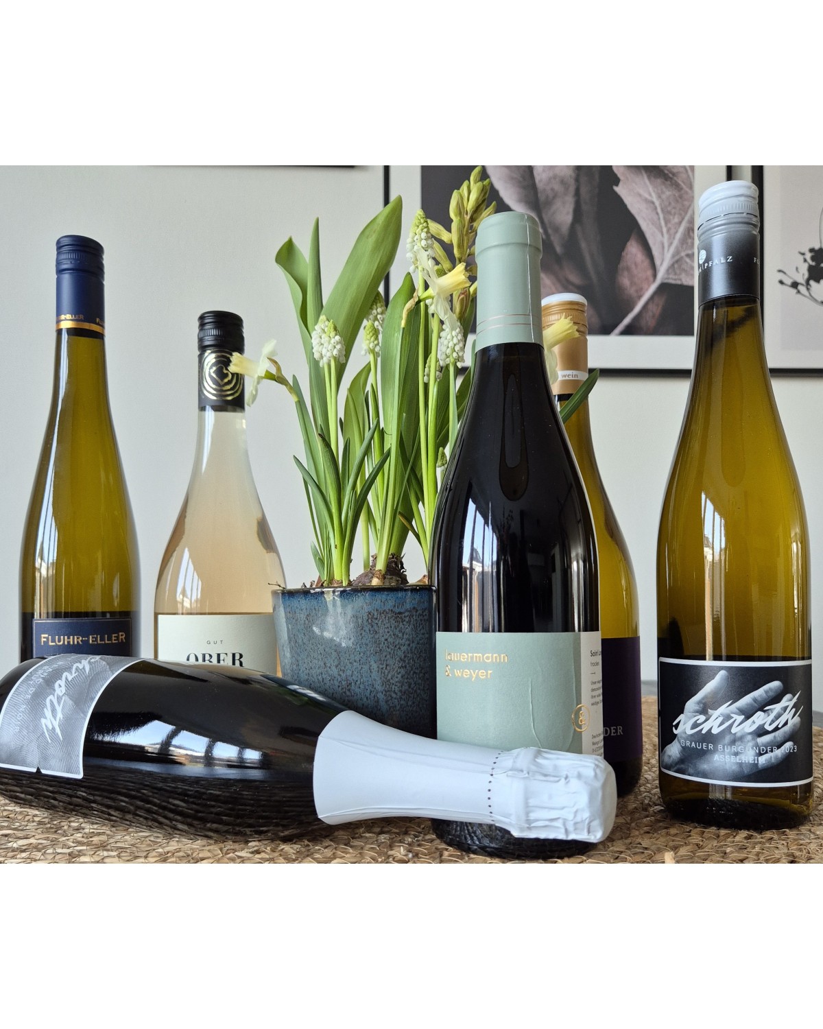 3 frisse witte wijnen, 1 bubbel, 1 rose en 1 lichte rode wijn.